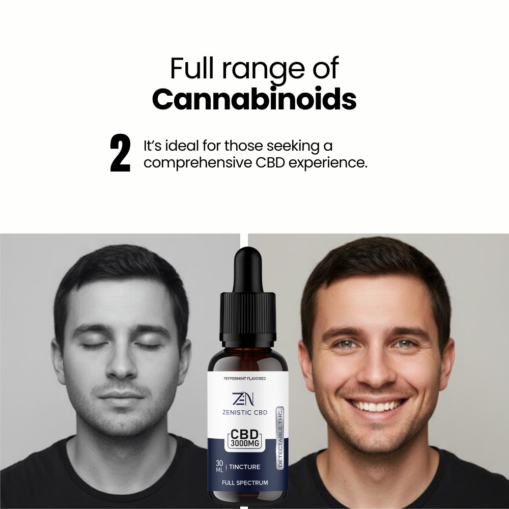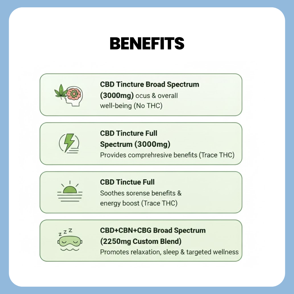 Next, we have the CBD Tincture Full Spectrum, also with 3000mg CBD. This option includes a full range of cannabinoids, including a trace amount of THC, to deliver the entourage effect, enhancing the overall benefits of the tincture. It’s ideal for those seeking a comprehensive CBD experience.