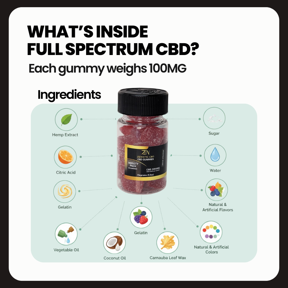 Ingredients: Hemp extract, pectin, citric acid, sugar, water, corn syrup, gelatin, a combination of natural and artificial flavors, vegetable oil, coconut oil, carnauba leaf wax, and a variety of natural and artificial colors.